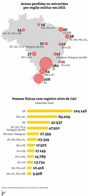 A maior quantidade de armas roubadas ou extraviadas no Brasil foi registrada na região militar correspondente ao estado de São Paulo: foram 380 apenas em 2021. São Paulo é justamente a região com mais registros de CACs em todo o país. São mais de 104 mil pessoas físicas com registro ativo, informados pelo Exército em setembro de 2021.