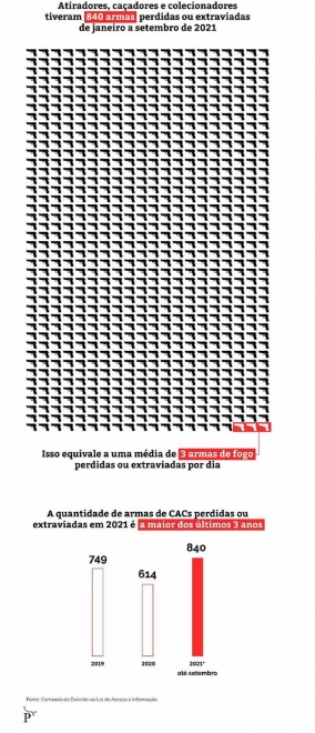 A maior parte dessas armas foi levada em roubos ou furtos: 692 neste ano, uma média de 2,5 por dia. O número é maior que em 2020 e em 2019. A legislação estabelece que no caso de arma roubada ou extraviada, um CAC deve procurar uma unidade policial local para fazer um boletim de ocorrência e levar uma série de documentos para comunicar à Diretoria de Fiscalização de Produtos Controlados (DFPC).