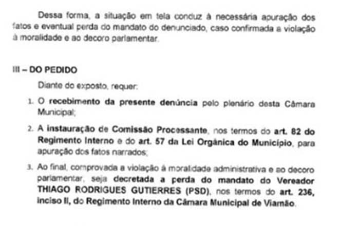 A representação tem amparo no artigo 82 do Regimento Interno e no artigo 57 da Lei Orgânica do Município, dispositivos que preveem a criação de uma comissão para garantir o contraditório e o devido processo legal. Caso as investigações confirmem as irregularidades, o pedido solicita a cassação do mandato de Thiago Gutierres, conforme o artigo 236, inciso II, do Regimento Interno da Câmara.