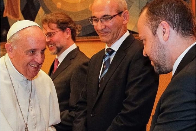 : Papa Francisco cumprimena Anderson no Vaticano: santidade lembrou que o assessor brasileiro era colorado