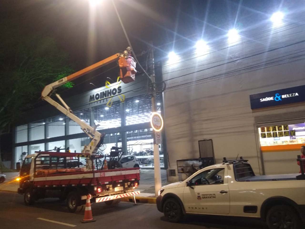 Desde a noite de 19 de novembro, equipes do Departamento de Iluminação Pública da Secretaria Municipal de Infraestrutura (Seinfra) trabalham no rebaixamento do cabeamento das principais vias, etapa necessária para a instalação dos ornamentos luminosos que irão compor a tradicional iluminação natalina. O serviço ocorre preferencialmente à noite para reduzir impacto na mobilidade urbana.