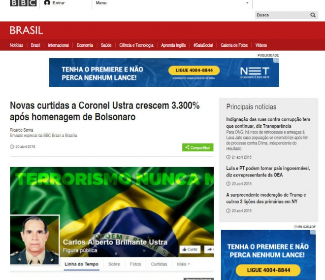 A página reunia, até o fechamento desta reportagem, 17 mil fãs. Antes do discurso de Jair Bolsonaro, o número de seguidores se mantinha estável. Pelo menos quatro páginas na rede social foram criadas para homenagear o torturador.