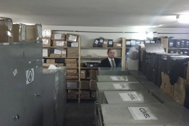 : Jean em um andar reservado na sede da PGM para as pilhas e pilhas de caixas com processo ainda ativos