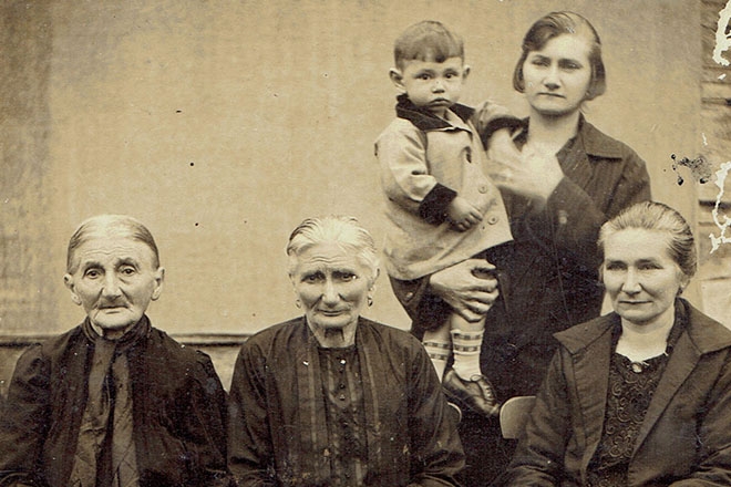 : Ivo, criança, no colo da mãe, Erna, com a avó Elvira, a bisavó Luiza e a tataravó Cristina
