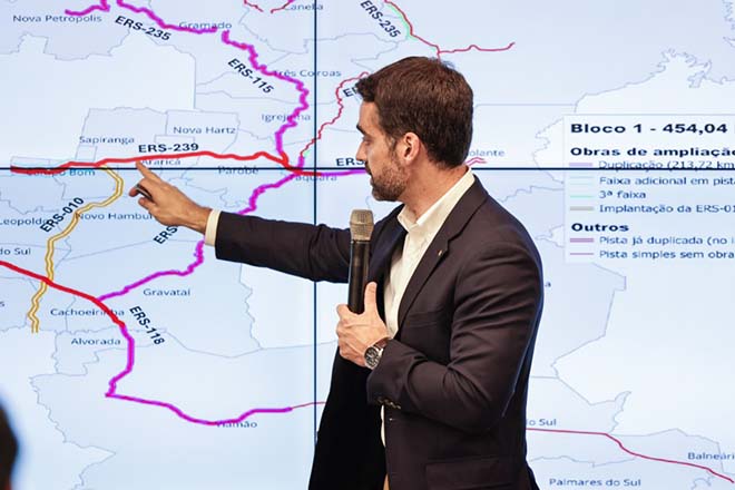 O projeto foi apresentado na terça-feira (28), em Porto Alegre. O governador anunciou investimentos de R$ 6,4 bilhões na concessão do Bloco 1, com 454 quilômetros de rodovias que serão operadas pela iniciativa privada por 30 anos, e confirmou que o Estado entrará com aporte de R$ 1,5 bilhão via Funrigs — o fundo de reconstrução pós-enchente criado a partir da suspensão do pagamento da dívida do Rio Grande do Sul com o governo federal.