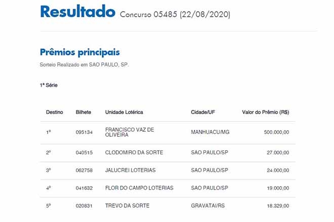 O quinto prêmio da Loteria Federal do dia 22 saiu para Gravataí. O bilhete 020831, comprado no Trevo da Sorte, lotérica do Centro, rendeu R$ 18.329,00.