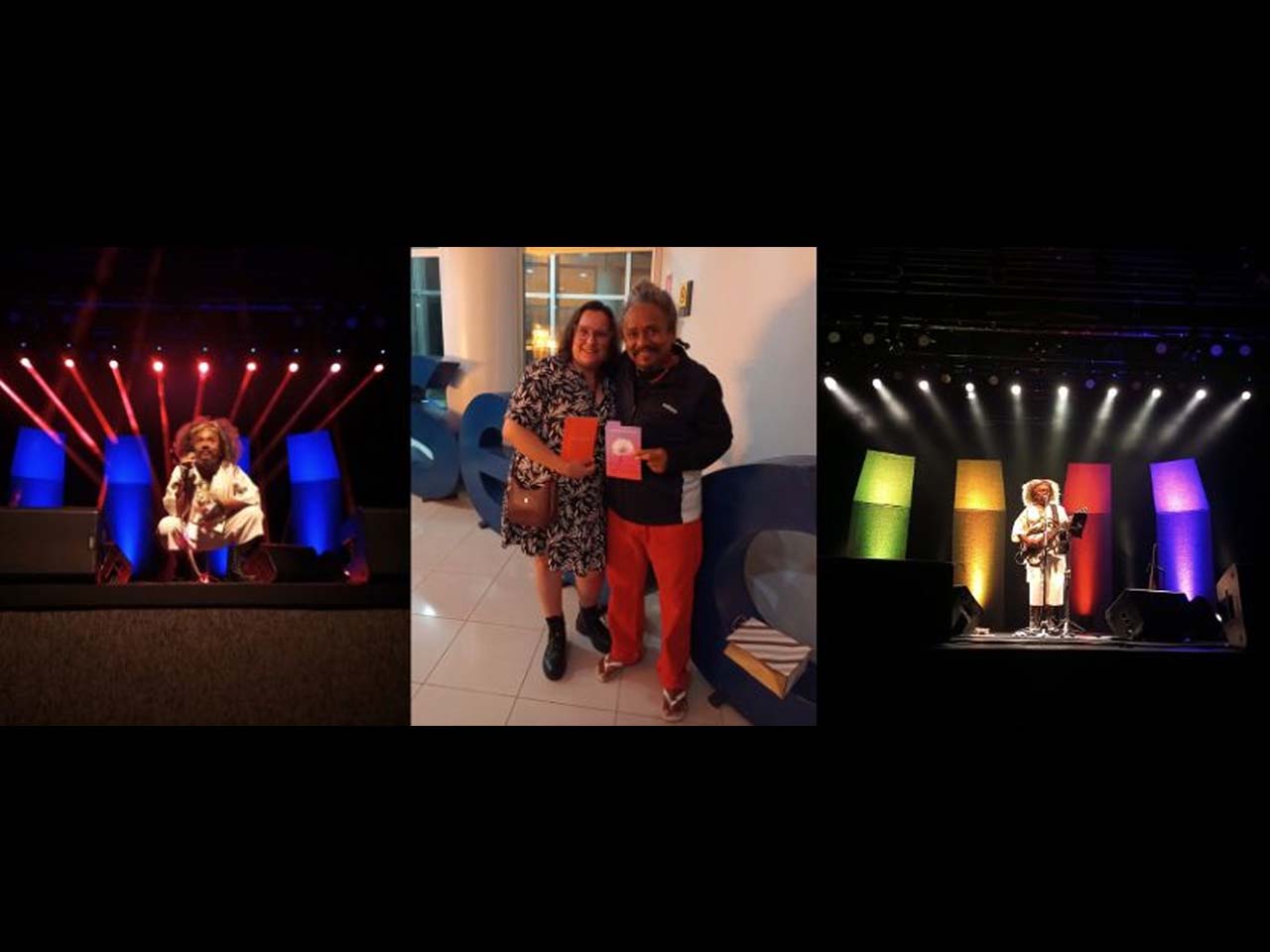 Claro que depois esperei para tirar uma foto com o Chico. Também comprei o livro dele de poemas, que eu queria adquirir desde que soube do lançamento (e tem tempo isso, eu morava no Rio de Janeiro). Então dei o abraço tão esperado nesse gênio da música e da palavra, entreguei um presente (meus livros e zines numa sacolinha), recebi o autógrafo dele no livro, e quando fomos posar para a foto, ele lembrou que tinha ganhado meu livro e fez questão de segurá-lo, da mesma forma que eu segurava a obra dele. Chico César tirou foto segurando meu livro! Saí do Sesc ainda em êxtase.